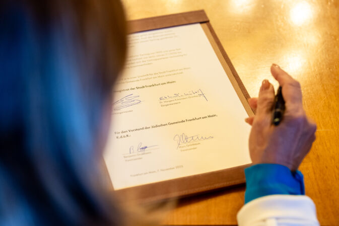 Mehr als drei Jahrzehnte später erneuern wir dieses Versprechen: Der neue Vertrag wurde von Oberbürgermeister Mike Josef, Bürgermeisterin Nargess Eskandari-Grünberg sowie den Vertretern der Jüdischen Gemeinde Benjamin Graumann und Marc Grünbaum unterzeichnet.