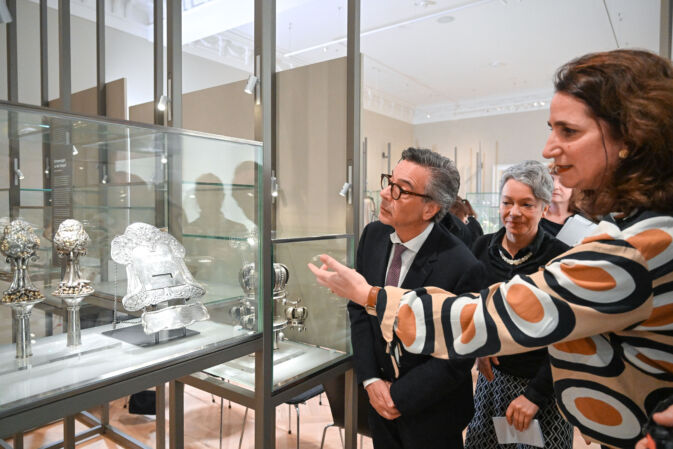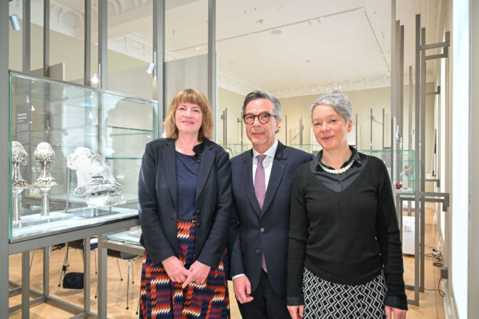 Der Silberschmuck stammt aus der 1938 zerstörten Börneplatz-Synagoge. Gemeinsam mit einem bereits im Besitz der Gemeinde befindlichen Anhänger wird das Ensemble nun erstmals seit 88 Jahren wieder vollständig gezeigt.